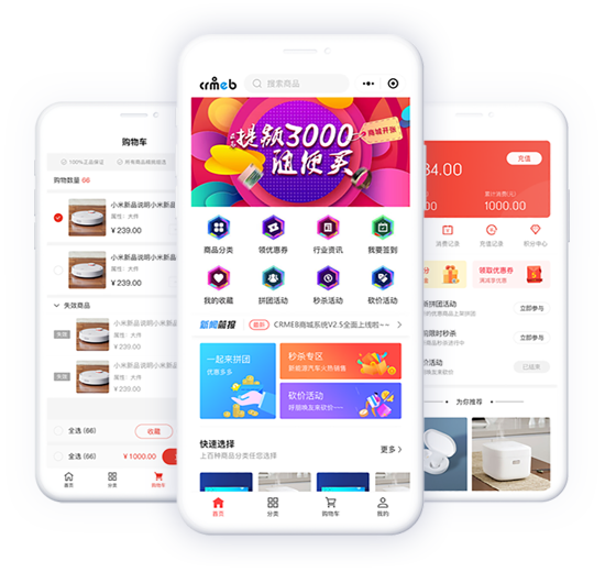 裂变红包、分销、秒杀、拼团、优惠券、积分商城、订单管理、附近门店、到店自提、核销、会员等级、余额充值、商家入驻等……